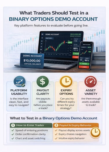 That is why a demo account is not just a convenience. It is a screening tool. It helps traders answer practical questions before they take live risk. Does the platform feel stable? Is payout visible before the trade is confirmed? Are expiry choices easy to understand? Does the broker look built for real trading, or only for fast signups?