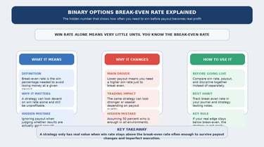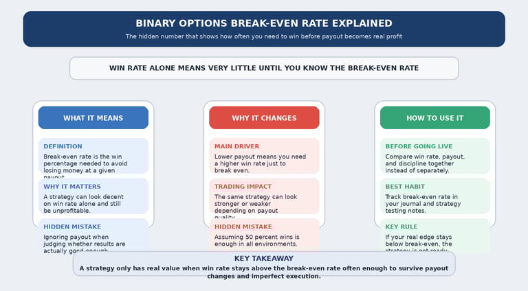 Break-even rate is the hidden number many binary options traders ignore because win rate feels easier to understand. But once payout enters the equation, win rate by itself is not enough. Break-even rate shows whether your current performance is actually good enough to avoid long-term losses.