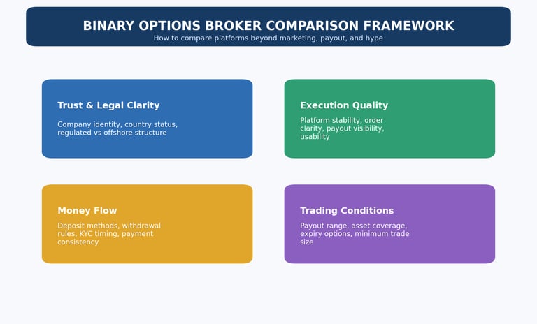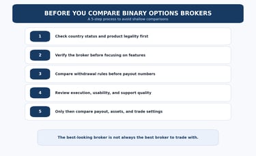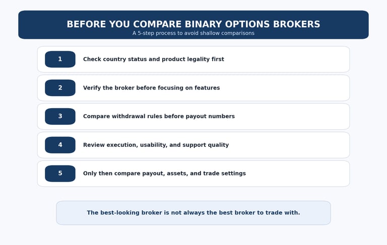 This is exactly why the best comparison logic sits on top of how to verify a binary options broker before you deposit and the binary options scam red flags guide. If the trust layer is weak, the comparison should usually stop there.