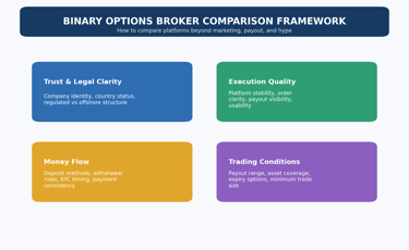 Trust comes first because a broker that is difficult to verify should not be rescued by strong marketing. This is why broker comparison should connect directly to regulated vs offshore binary options brokers and where binary options are banned, restricted, or unregulated. A platform cannot be judged properly without understanding the environment it operates in.