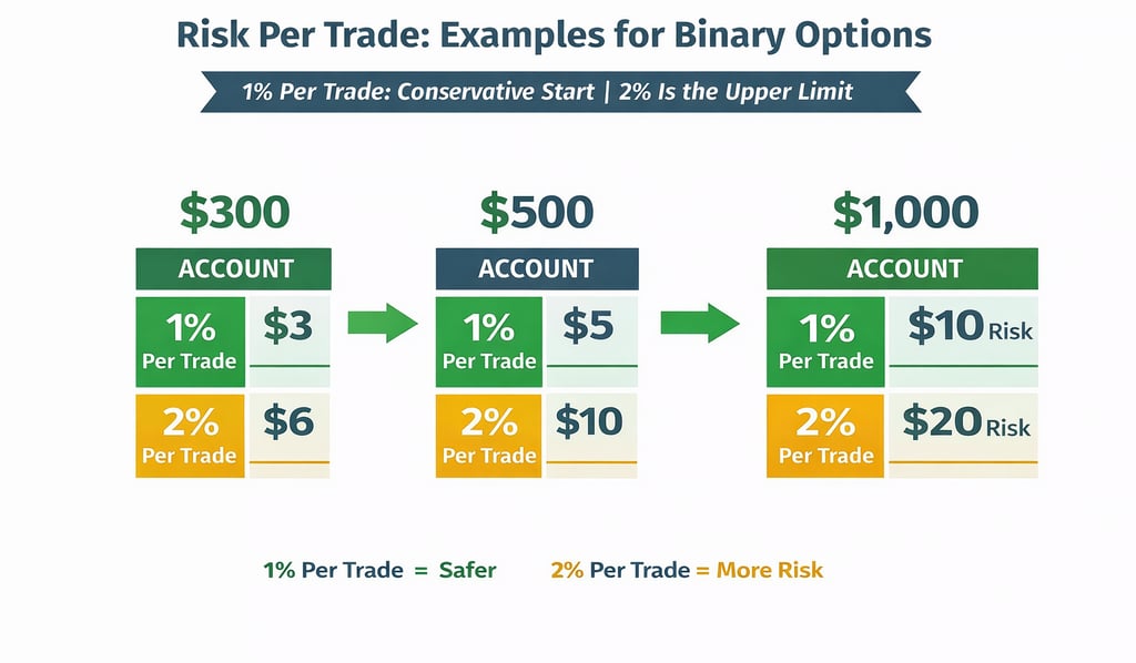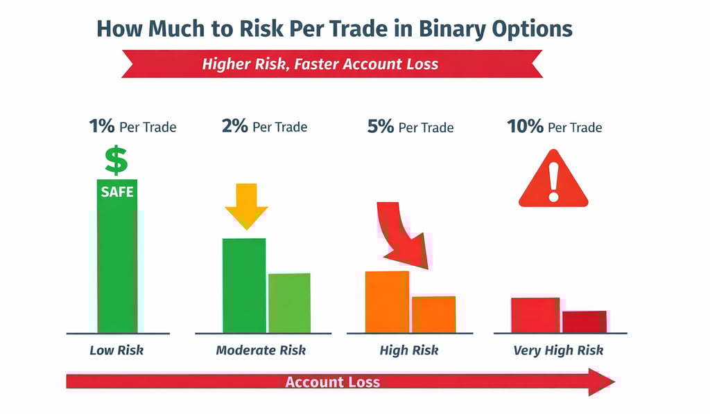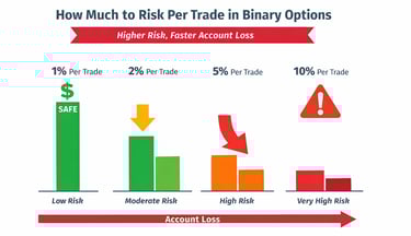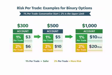 For most traders, the safest starting point is simple: risk a small percentage of the account on each trade. In practice, that usually means around 1% per trade for beginners and up to 2% per trade for disciplined traders with more consistency. In binary options, where losses are fixed and trades can happen quickly, that discipline matters even more.