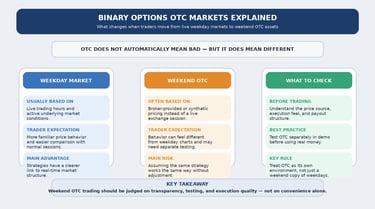 This is exactly why OTC trading should be reviewed alongside Binary Options Scam Red Flags: How to Spot an Untrustworthy Broker, How to Verify a Binary Options Broker Before You Deposit, and Binary Options Withdrawal Problems: Why Traders Get Stuck. Weekend access can be attractive, but it should never distract from broker reliability.