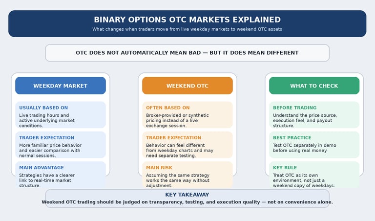 This is where demo testing matters. Traders should use a demo account to compare weekday assets and OTC assets rather than blending them together in one set of assumptions. Watch how price moves, how quickly momentum fades, and whether your normal entry standards still hold up. That is why Best Binary Options Demo Accounts: What Traders Should Test Before Going Live is directly relevant here.