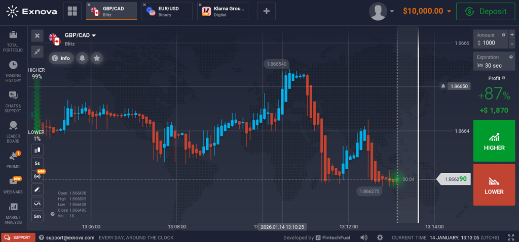 Exnova uses a fixed-expiry trading model, where each position is resolved at a predefined time rather than managed through stop-loss or take-profit levels. Once a trade is placed, the expiry cannot be adjusted, and there are no early close options.