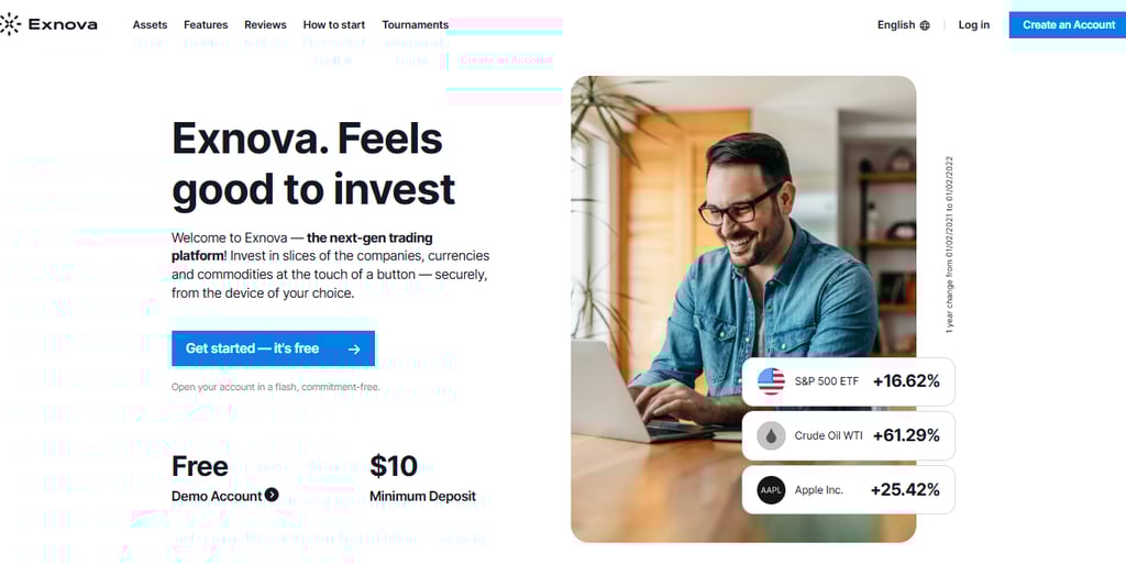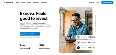 Exnova is a multi-asset trading platform offering fixed-time trades and CFD-style instruments, with a $10 minimum deposit and a readily available demo account. The platform emphasizes ease of access and a clean interface.