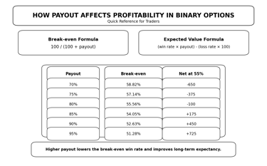 This is one of the most important concepts in binary options. A trader may believe a strategy is good because the win rate looks respectable, but if the payout is too low, that same strategy may still lose money.