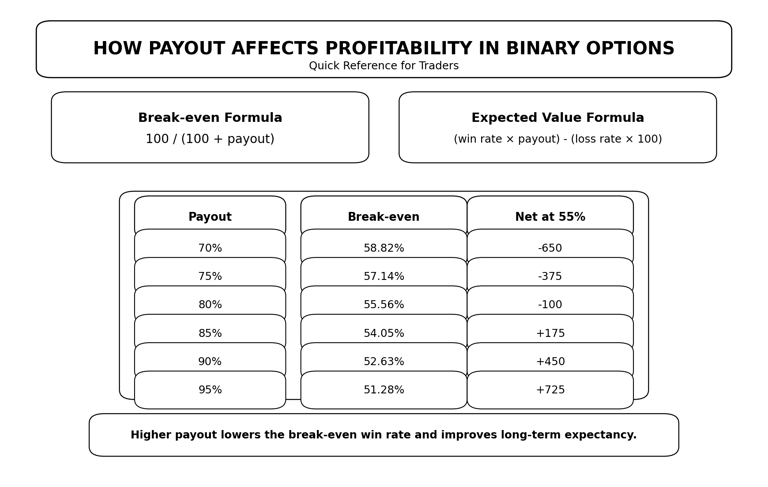 A setup that seems profitable under one payout level may become negative under another. This is especially important when traders move between assets or compare platforms.