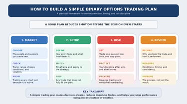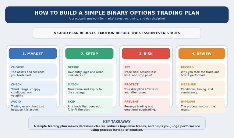 A better plan is one that stays clear under pressure. It should answer a few essential questions: What market am I trading? What setup am I looking for? What expiry fits it? How much risk am I taking? When do I stop? If those answers are clear, the plan is already doing its job.