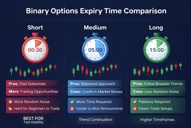 For most beginners, medium expiries are usually the best place to start. They are less random than ultra-short contracts and give price action more time to develop naturally. A trader using 3 to 5 minute expiries will often learn more about market behavior, timing, and discipline than someone jumping straight into 30-second trades.