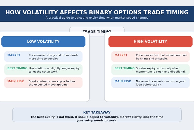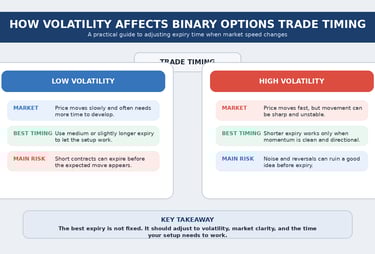 Volatility changes trade timing more than most binary options traders think. It influences how quickly price moves, how much noise enters the chart, and whether a setup needs more time or less. Traders who ignore volatility often end up using the same expiry everywhere, then wonder why their results never feel stable.