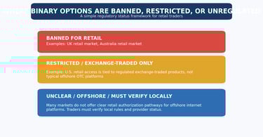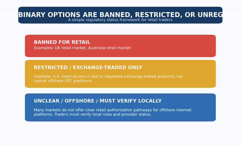 The problem is that this question often sounds simpler than it really is. Binary options are not governed in one uniform way across the world. In some markets, they are banned for retail traders. In others, they are restricted to regulated exchange-traded products. In many places, the practical reality is even more confusing: offshore platforms may still be accessible online, but that does not mean they are clearly authorized for retail clients in that jurisdiction.