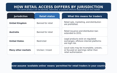 Some jurisdictions clearly ban them for retail traders. Some restrict them to regulated exchange environments. Others leave traders in a much more uncertain position, where offshore availability can create the illusion of legitimacy without offering the protections of a clearly authorized local retail market.