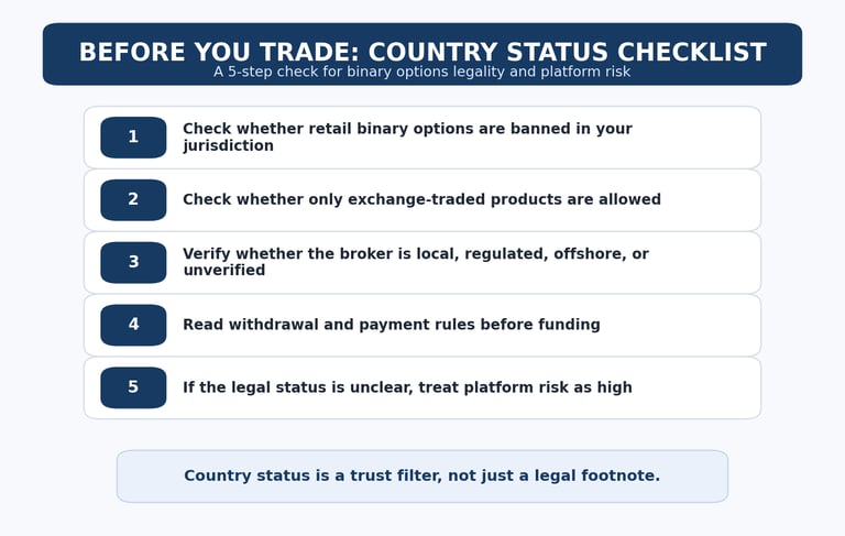 If you want to compare platforms more carefully, use compare binary options brokers only after you have checked the legal and country-status layer first.
