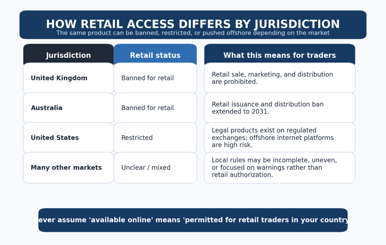 That is why traders should stop thinking in binary terms such as “legal” or “illegal” alone. A more useful framework is this: banned, restricted, or unregulated.